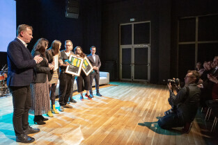 Gdańsk. W klubie Żak odbyła się uroczystość wręczenia Nagrody Miasta Gdańska dla Młodych Twórców w Dziedzinie Kultury. Nz. Wspólne zdjęcie wszystkich nominowanych artystów