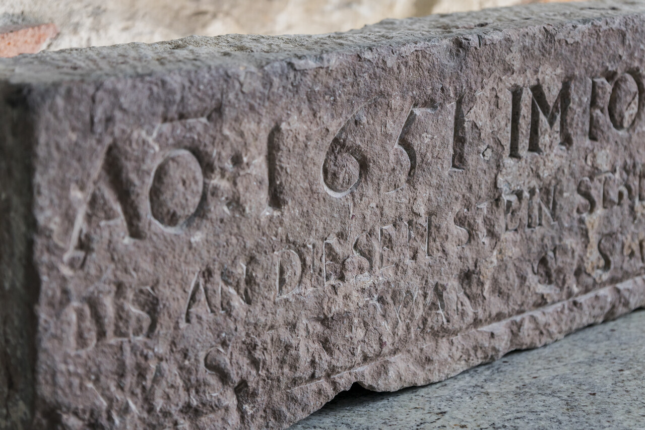 Kamień wysokiej wody z XVII w., odkryty podczas prac przy zachodniej elewacji Żurawia. Inskrypcja zawiera informację o poziomie wody podczas powodzi w 1651 r.