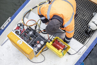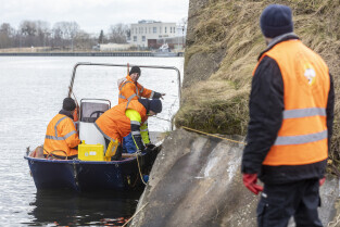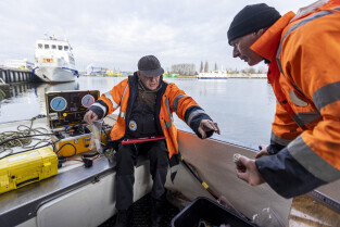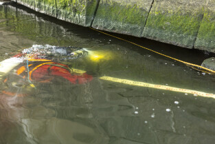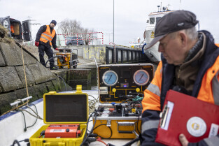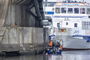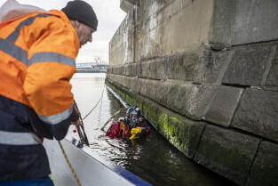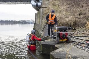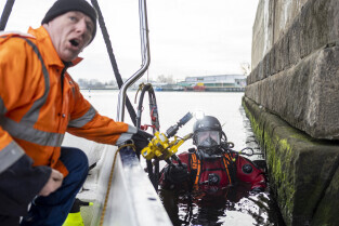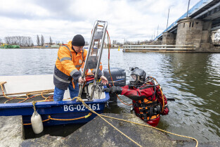 Gdańsk. Zespół nurków z Zakładu Usług Podwodnych i Technicznych Denis Andrzej, pobiera próbki z drewnianych pali podtrzymujących przyczułek Mostu Siennickiego od strony ul. Głębokiej.