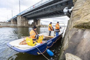 Gdańsk. Zespół nurków z Zakładu Usług Podwodnych i Technicznych Denis Andrzej, pobiera próbki z drewnianych pali podtrzymujących przyczułek Mostu Siennickiego od strony ul. Głębokiej. Nz. Szymon Denis i nurek Wiktor Promiński