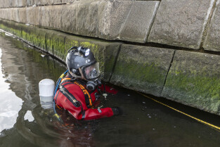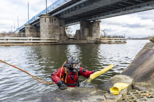 Gdańsk. Zespół nurków z Zakładu Usług Podwodnych i Technicznych Denis Andrzej, pobiera próbki z drewnianych pali podtrzymujących przyczułek Mostu Siennickiego od strony ul. Głębokiej. Nz. Nurek Wiktor Promiński