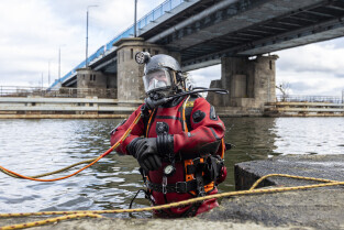 Gdańsk. Zespół nurków z Zakładu Usług Podwodnych i Technicznych Denis Andrzej, pobiera próbki z drewnianych pali podtrzymujących przyczułek Mostu Siennickiego od strony ul. Głębokiej. Nz. nurek Szymon Denis