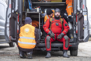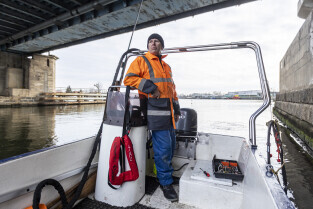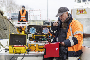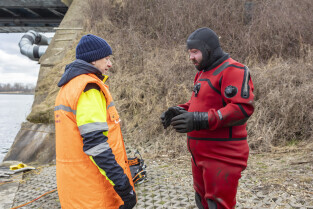 Gdańsk. Zespół nurków z Zakładu Usług Podwodnych i Technicznych Denis Andrzej, pobiera próbki z drewnianych pali podtrzymujących przyczułek Mostu Siennickiego od strony ul. Głębokiej. Nz. Szef Zespołu Andrzej Denis i jego syn Szymon Denis