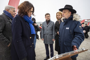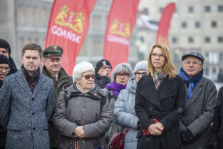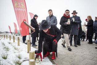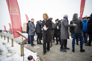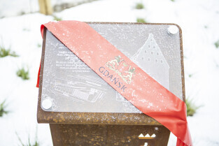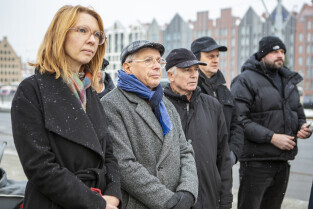 Prezydent Aleksandra Dulkiewicz, Michał Samet, przewodniczący Gminy Wyznaniowej Żydowskiej w Gdańsku oraz radni Anna Golędzinowska, Andrzej Kowalczys, Andrzej Stelmasiewicz i Michał Hajduk, wzięli udział w uroczystym odsłonięciu tablicy poświęconej budynkowi gdańskiego Getta.