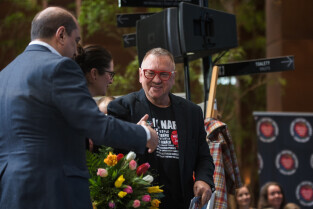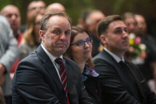 Gdańsk, ECS. Ogłoszenie wyniku 27. Finału WOŚP - konferencja prasowa. Nz. Mieczysław Struk (marszałek woj. pomorskiego)