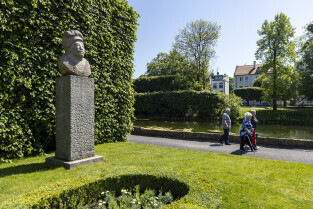 Gdańsk. Kilka zdjęć ze skąpanej w słońcu i zieleni Oliwy. Nz. Popiersie księcia Świętopełka II