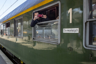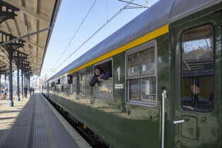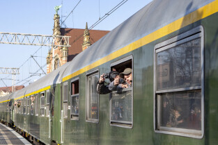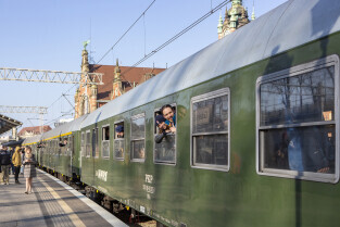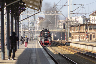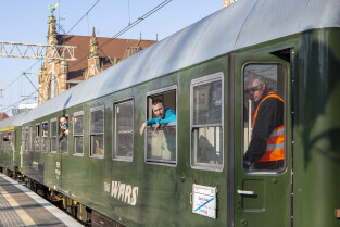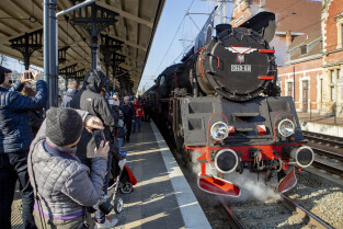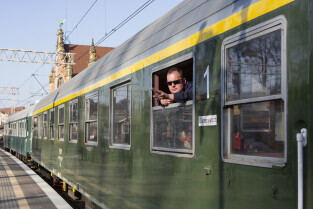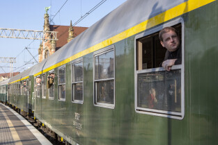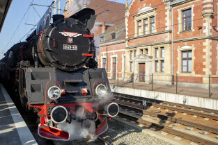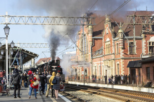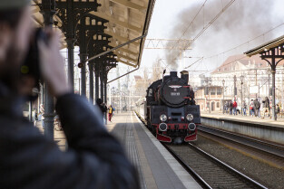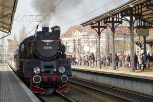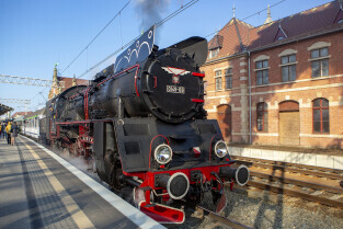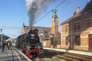 Gdańsk Główny PKP. Pociąg relacji Gdynia Główna - Kościerzyna ciągnięty przez zabytkowy parowóz Ol 49 - 69