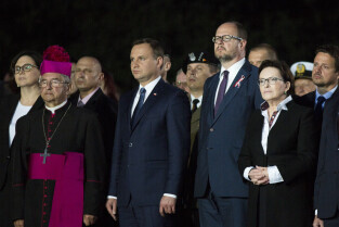 Gdańsk Westerplatte. 76. rocznica wybuchu II Wojny Światowej. Nz. od lewej: Prezydent RP Andrzej Duda, Prezydent Gdańska Paweł Adamowicz, Premier RP Ewa Kopacz