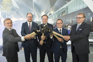 Port Lotniczy Gdańsk im. Lecha Wałęsy. Uroczystość otwarcia nowej części przylotowej Terminalu Pasażerskiego. Nz. od lewej: Prezydent Gdyni Wojciech Szczurek, Prezydent Gdańska Paweł Adamowicz, Marszałek Woj. Pomorskiego Mieczysław Struk, Wiceprezydent Sopotu Marcin Skwierawski, Z-ca Dyrektora Naczelnego Przedsiębiorstwa Państwowego „Porty Lotnicze” Andrzej Hawryluk