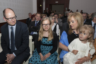 Prezydent Gdańska Paweł Adamowicz otrzymał tytuł "Człowieka Roku 2012" w konkursie organizowanym przez Dziennik Bałtycki. Sopot, Grand Hotel. Nz. od lewej: Prezydent Gdańska Paweł Adamowicz z żoną Magdaleną oraz córkami Antoniną i Teresą (po prawej)