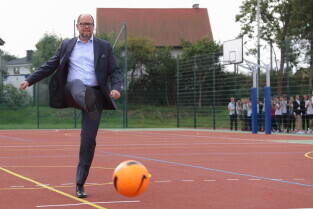 Gdańsk. Otwarcie dziewięćdziesiątego dziewiątego boiska przyszkolnego przy Szkole Podstawowej nr 82. Nz. Prezydent Gdańska Paweł Adamowicz.