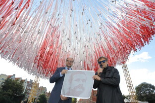 Gdańsk, Targ Węglowy. Otwarcie instalacji Jerzego Janiszewskiego. Nz. Prezydent Gdańska Paweł Adamowicz i Jerzy Janiszewski.