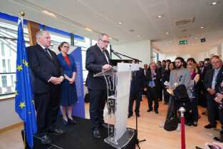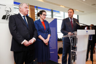 Uroczystość upamiętniająca zmarłego tragicznie prezydenta Gdańska Pawła Adamowicza. Bruksela, siedziba Europejskiego Komitetu Regionów. Nz. przemawia Piotr Adamowicz, z tyłu Karl-Heinz Lambertz przewodniczący Komitetu i Aleksandra Dulkiewicz prezydent Gdańska