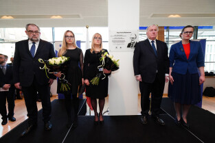 Uroczystość upamiętniająca zmarłego tragicznie prezydenta Gdańska Pawła Adamowicza. Bruksela, siedziba Europejskiego Komitetu Regionów. Nz. po prawej Karl-Heinz Lambertz przewodniczący Komitetu i Aleksandra Dulkiewicz prezydent Gdańska, po lewej Piotr, Antonina i Magdalena Adamowicz