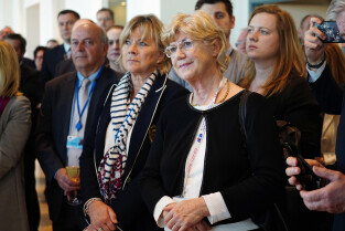 Uroczystość upamiętniająca zmarłego tragicznie prezydenta Gdańska Pawła Adamowicza. Bruksela, siedziba Europejskiego Komitetu Regionów. Nz. Aleksandra Dulkiewicz prezydent Gdańska, Antonina i Magdalena Adamowicz