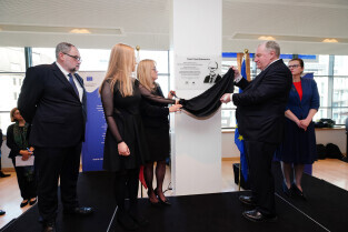 Uroczystość upamiętniająca zmarłego tragicznie prezydenta Gdańska Pawła Adamowicza. Bruksela, siedziba Europejskiego Komitetu Regionów. Nz. Boris Essender, Aleksandra Dulkiewicz prezydent Gdańska, Antonina Adamowicz, Magdalena Adamowicz, Karl-Heinz Lambertz przewodniczący Komitetu