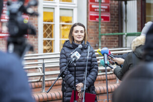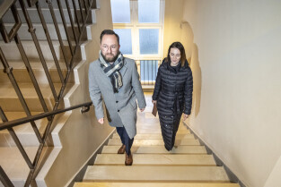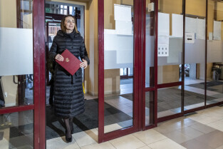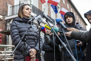 Gdańsk. Pierwszy dzień urzędowania nowo powołanej wojewody pomorskiej Beaty Rutkiewicz. Nz. Pani Wojewoda wchodzi do urzędu w towarzystwie radnego Krystiana Kłosa