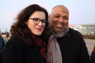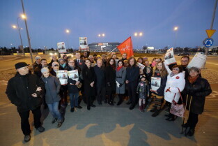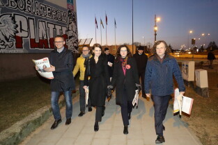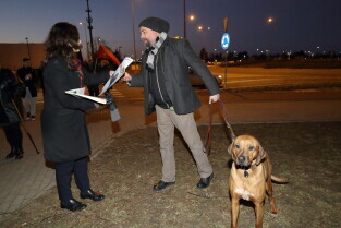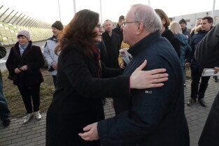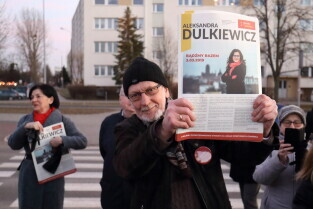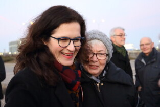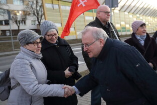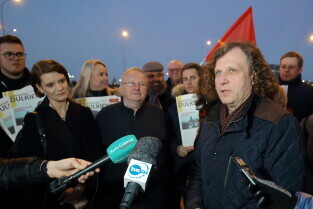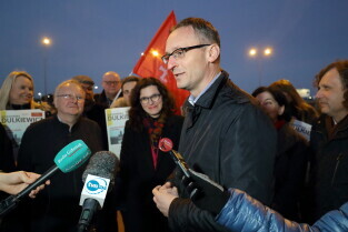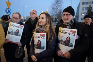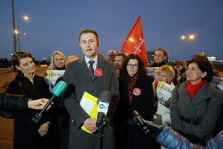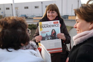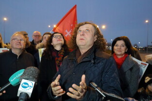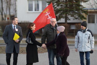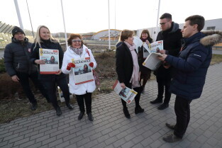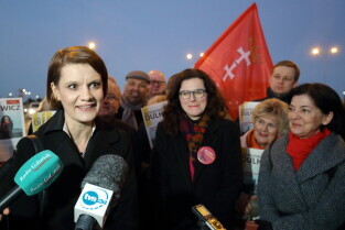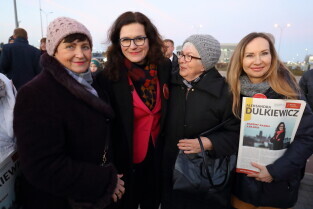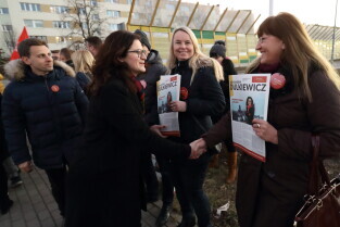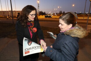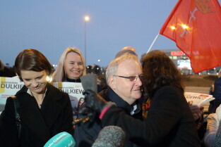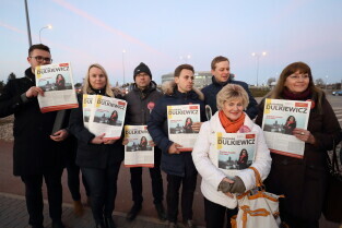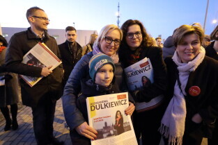 Gdańsk. Przy masztach z flagami obok hali widowiskowej Ergo Arena, odbyła się konferencja prasowa, na której przedstawiciele pomorskich samorządów wraz z przedstawicielami Ruchu Młodej Polski udzielili poparcia kandydatce na urząd Prezydenta Miasta Gdańska Aleksandrze Dulkiewicz.
