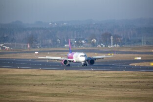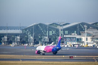 Gdańsk. W hotelu Holiday Inn odbyła się konferencja prasowa, na której prezes Portu Lotniczego Gdańsk, Tomasz Kloskowski podsumował wyniki lotniska w 2022 roku i przedstawił plany na nadchodzące lata. Nz. Na pasie lotniska samolot linii WizzAir