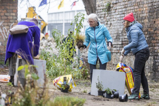 Gdańsk. W ramach rewitalizacji Biskupiej Górki BRG prowadzi działania społeczne, w tym tzw. działania podwórkowe, polegające na sprzątaniu, grodzeniu i sadzeniu roślinności. Nz. Mieszkanka pobliskiej kamienicy, pani Sabina