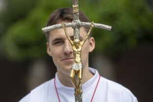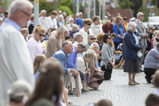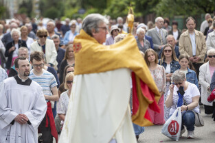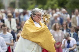 Gdańsk. Procesja Bożego Ciała zorganizowana przez parafię Zmartwychwstania Pańskiego przeszła ulicami dzielnicy Strzyża. Nz. ks. Józef Domoradzki CR - proboszcz i kustosz sanktuarium