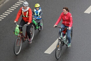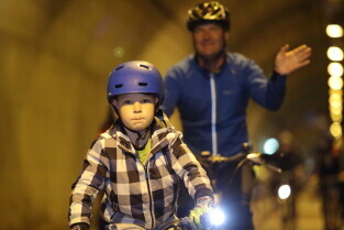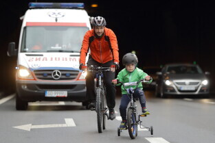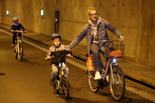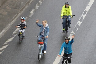 Gdańsk. Przejazd rowerowy przez tunel pod Martwą Wisłą z okazji jego trzecich urodzin, a także 15. rocznicy wejścia Polski do Unii Europejskiej. Nz. Prezydent Gdańska Aleksandra Dulkiewicz z córką Zosią.