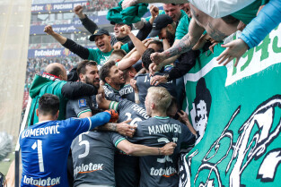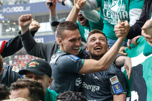 Warszawa. Puchar Polski 2018/2019, mecz finałowy Jagiellonia Białystok - Lechia Gdańsk. Nz. Artur Sobiech po strzelonej bramce