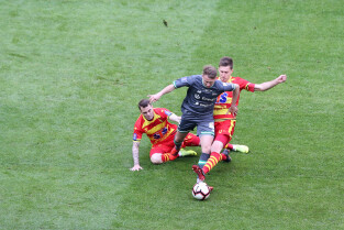 Warszawa. Puchar Polski 2018/2019, mecz finałowy Jagiellonia Białystok - Lechia Gdańsk. Nz. Daniel Łukasik, Patryk Klimala, Błażej Augustyn