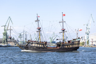 Gdańsk. Rejs po gdańskim porcie na pokładzie żaglowca J.R.Tolkien. Nz. galeon Lew