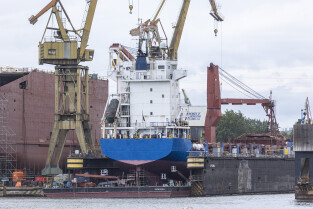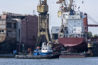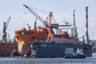 Gdańsk. Rejs po gdańskim porcie na pokładzie żaglowca J.R.Tolkien. Nz. Suchy dok stoczni Remontowej