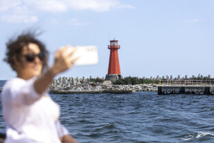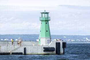 Gdańsk. Rejs po gdańskim porcie na pokładzie żaglowca J.R.Tolkien. Nz. Latarnia na wejściu do portu