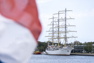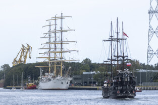 Gdańsk. Rejs po gdańskim porcie na pokładzie żaglowca J.R.Tolkien. Nz. Żaglowiec Dar Młodzieży