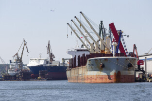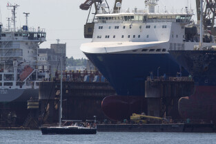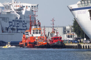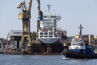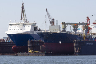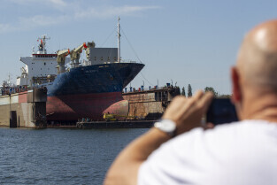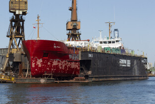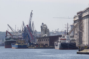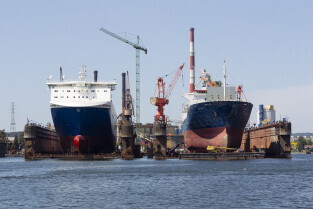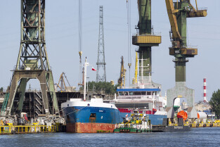 Gdańsk. Długie Pobrzeże, Żuraw, Stocznia Gdańska czy port to tylko niekóre atrakcje jakie można zobaczyć z pokładu statku wycieczkowego Smiltyne Żeglugi Gdańskiej. Nz. Statki remontowane w suchych dokach Stoczni Remontowej.