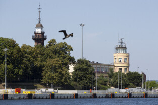 Gdańsk. Długie Pobrzeże, Żuraw, Stocznia Gdańska czy port to tylko niekóre atrakcje jakie można zobaczyć z pokładu statku wycieczkowego Smiltyne Żeglugi Gdańskiej. Nz. Latarnia Morska w Nowym Porcie i Kapitanat Portu w Gdańsku.