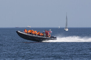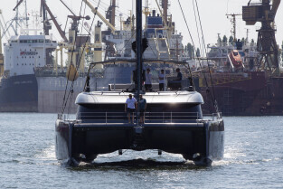 Gdańsk. Długie Pobrzeże, Żuraw, Stocznia Gdańska czy port to tylko niekóre atrakcje jakie można zobaczyć z pokładu statku wycieczkowego Smiltyne Żeglugi Gdańskiej. Nz. produkt jednej z gdanskich stoczni jachtowych udaje się w próbny rejs.