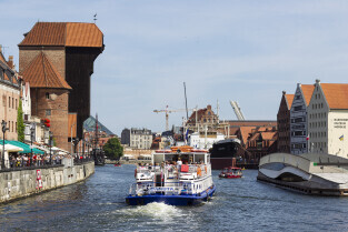 Gdańsk. Długie Pobrzeże, Żuraw, Stocznia Gdańska czy port to tylko niekóre atrakcje jakie można zobaczyć z pokładu statku wycieczkowego Smiltyne Żeglugi Gdańskiej. Nz. Statek wycieczkowy Danuta przepływa pod Żurawiem.