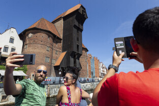 Gdańsk. Długie Pobrzeże, Żuraw, Stocznia Gdańska czy port to tylko niekóre atrakcje jakie można zobaczyć z pokładu statku wycieczkowego Smiltyne Żeglugi Gdańskiej. Nz. Turyści robią sobie pamiątkowe zdjęcie - selfie z gdańskim Żurawiem.
