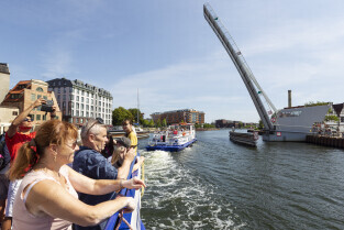 Gdańsk. Długie Pobrzeże, Żuraw, Stocznia Gdańska czy port to tylko niekóre atrakcje jakie można zobaczyć z pokładu statku wycieczkowego Smiltyne Żeglugi Gdańskiej. Nz. Turyści na pokładzie statku wycieczkowego Smiltyne przepływają pod kładką na Ołowiankę.