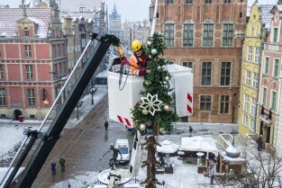 Gdańsk. Ekipa Energa Oświetlenie ustawia bożonarodzeniową choinką na Długim Targu.