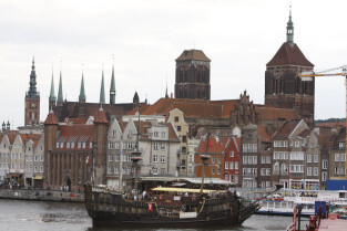 Statek wycieczkowy Galeon Lew cumujący do nabrzeża przy Targu Rybnym. W tle panorama Gdańsk