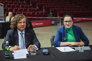 Ergo Arena. Sesje Rady Miasta Gdańska i Rady Miasta Sopotu. Nz. Prezydent Sopotu Jacek Karnowski i Prezydent Gdańska Aleksandra Dulkiewicz