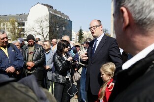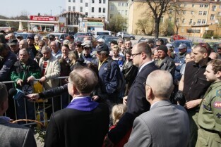 Wielkanocne śniadanie dla ubogich i bezdomnych zorganizowane przez gdańskich restauratorów. Gdańsk, Targ Węglowy. Nz. przemawia Prezydent Gdańska Paweł Adamowicz