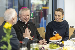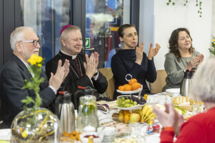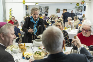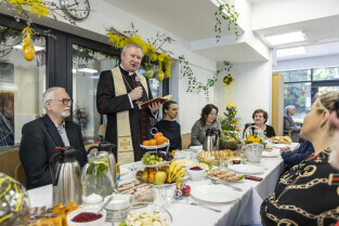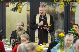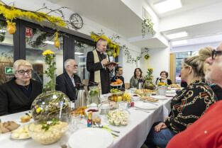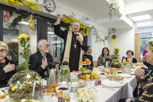 Śniadanie Wielkanocne w Domu Pomocy Społecznej na ul.Polanki z udziałem Moniki Chabior, Zastępczyni Prezydenta ds. rozwoju społecznego i równego traktowania, Teresy Wasilewskiej - Wiceprzewodniczącej Rady Miasta, radnego Andrzeja Stelmasiewicza oraz Biskupem Wiesławem Szlachetką