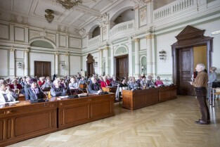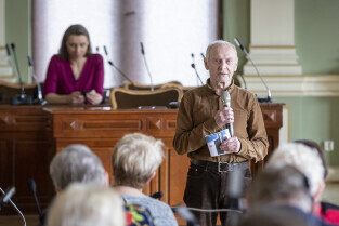 Gdańsk. Rada Miasta. Spotkanie z liderami grup nieformalnych polityki senioralnej. Nz. Przy mikrofonie Przewodnioczący rady Seniorów w Gdańsku Aleksander Żubrys.