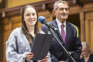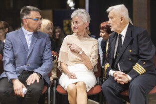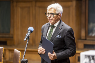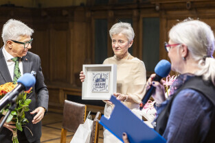 Gdańsk. W Ratuszu Staromiejskim odbyło się spotkanie z Laureatką Nagrody Naukowej Miasta Gdańska im. Jana Heweliusza – prof. dr hab. Hanną Mazur-Marzec. Nz. List od Prezydent Miasta odczytał radny Andrzej Kowalczys