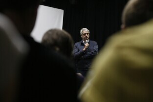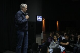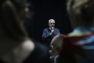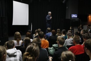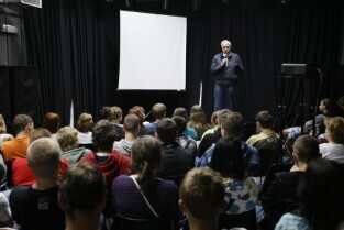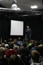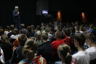 Bogusław Wołoszański poprowadził "Żywe lekcje historii" poświęcone II Wojnie światowej, zorganizowane dla gdańskiej młodzieży gimnazjalnej. Gdańsk, sala Sceny Muzycznej GAK