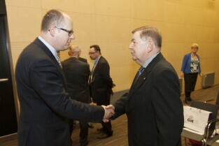 Gdańsk, Amber Expo. II Sympozjum pt. "Tunel drogowy pod Martwą Wisłą. Doświadczenia z budowy pierwszej rury tunelu". Nz. Prezydent Gdańska Paweł Adamowicz i Prezes spółki Gdańskie Inwestycje Komunalne Ryszard Trykosko (po prawej)