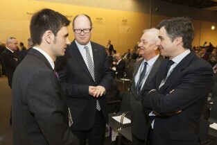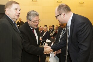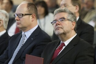 Gdańsk, Amber Expo. II Sympozjum pt. "Tunel drogowy pod Martwą Wisłą. Doświadczenia z budowy pierwszej rury tunelu". Nz. od lewej: prof. Bolesław Mazurkiewicz, Prezydent Gdańska Paweł Adamowicz, Podsekretarz Stanu w Ministerstwie Infrastruktury i Rozwoju Janusz Żbik, Prezes spółki Gdańskie Inwestycje Komunalne Ryszard Trykosko