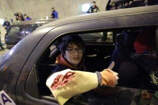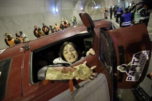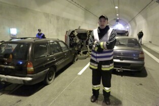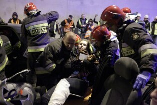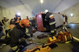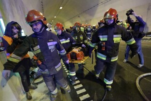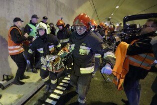 Gdańsk. W tunelu pod Martwą Wisłą odbyły się ćwiczeniach taktyczno-bojowe. Wzięli w nich udział strażacy, policjanci, ratownicy medyczni i pozoranci, w sumie ok. 70 osób oraz 20 pojazdów. Nz Rafał Pielacki - Zwycięzca Licytacji WOŚP 2015, w nagrodę wziął udział w ćwiczeniach taktyczno-bojowych. Straży Pożarnej
