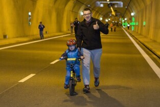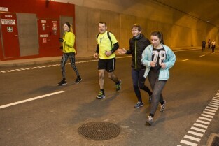 Gdańsk, tunel pod Martwą Wisłą. Biegacze podczas ostatniego dnia otwartego przed oficjalnym udostępnieniem obiektu.